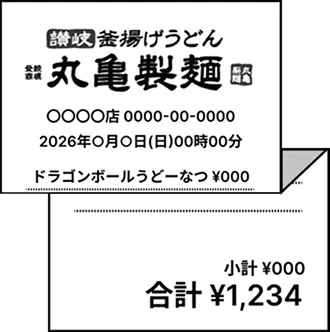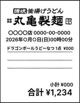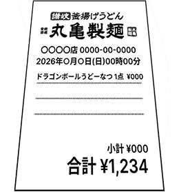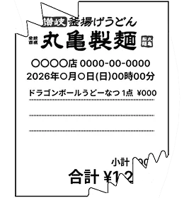 - ※対象商品を1回以上ご購入されているレシートが応募対象となります。「お好きなうどん」と「仙豆風天ぷらまたは元気玉おむすび」が複数枚のレシートに分かれている場合は、応募対象外となりますのでご注意ください。