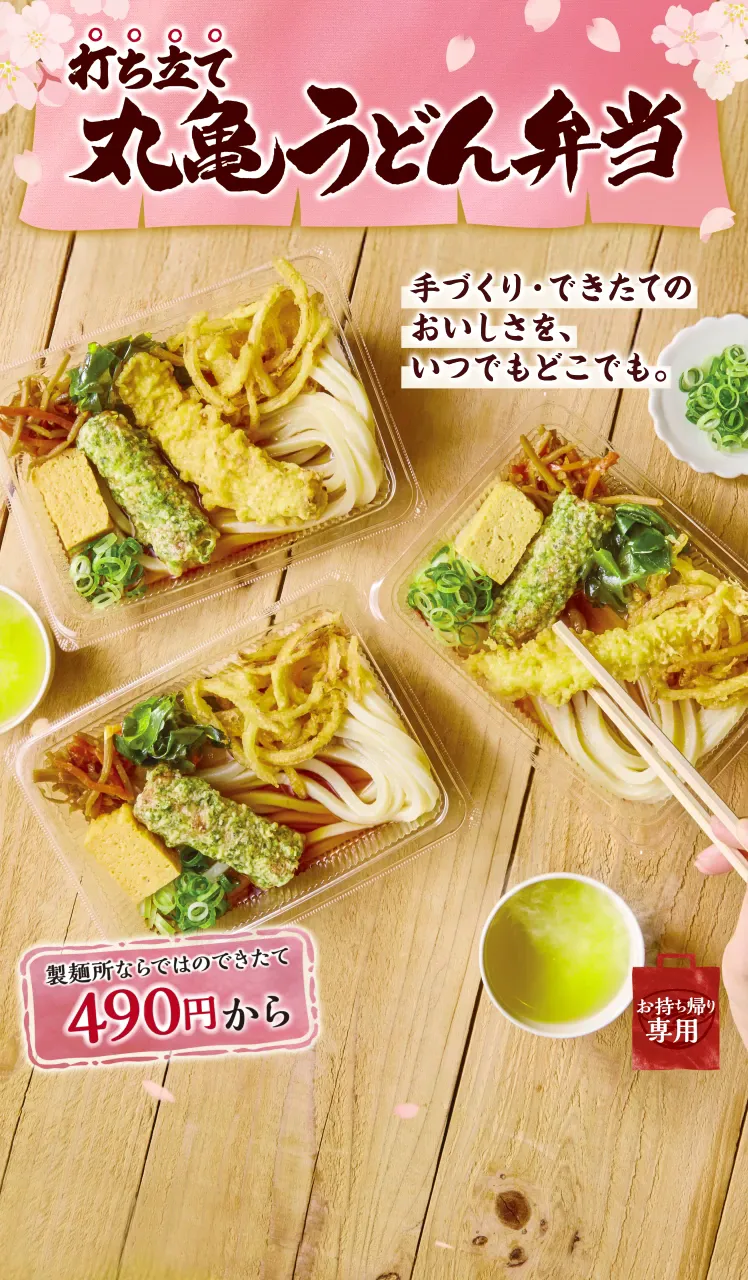 ・お持ち帰り商品は、2時間を目安にお早めにお召し上がりください。 ・上記はいずれも容器代を含む税込み価格です。 ・一部店舗では販売していない場合がございます。また、店舗により販売終了時期が異なる場合がございます。 ・丸亀うどん弁当の透明容器は、リサイクル原料を使用しています。